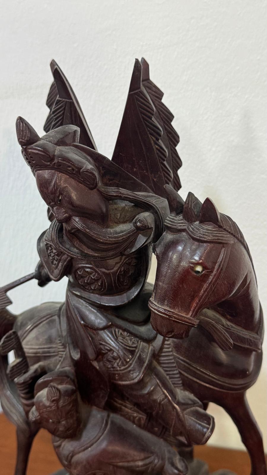 Magnificent handcrafted sculpture in rosewood, representing Guan Gong (Guan Yu), the legendary Chinese warrior from the Three Kingdoms period. This unique piece depicts the master strategist mounted on his horse, accompanied by a servant, in a dynamic and expressive composition.