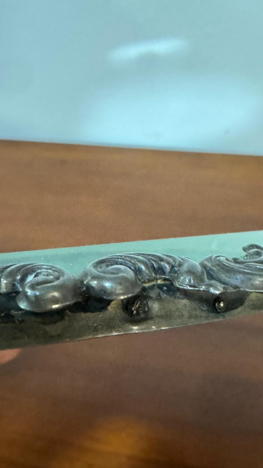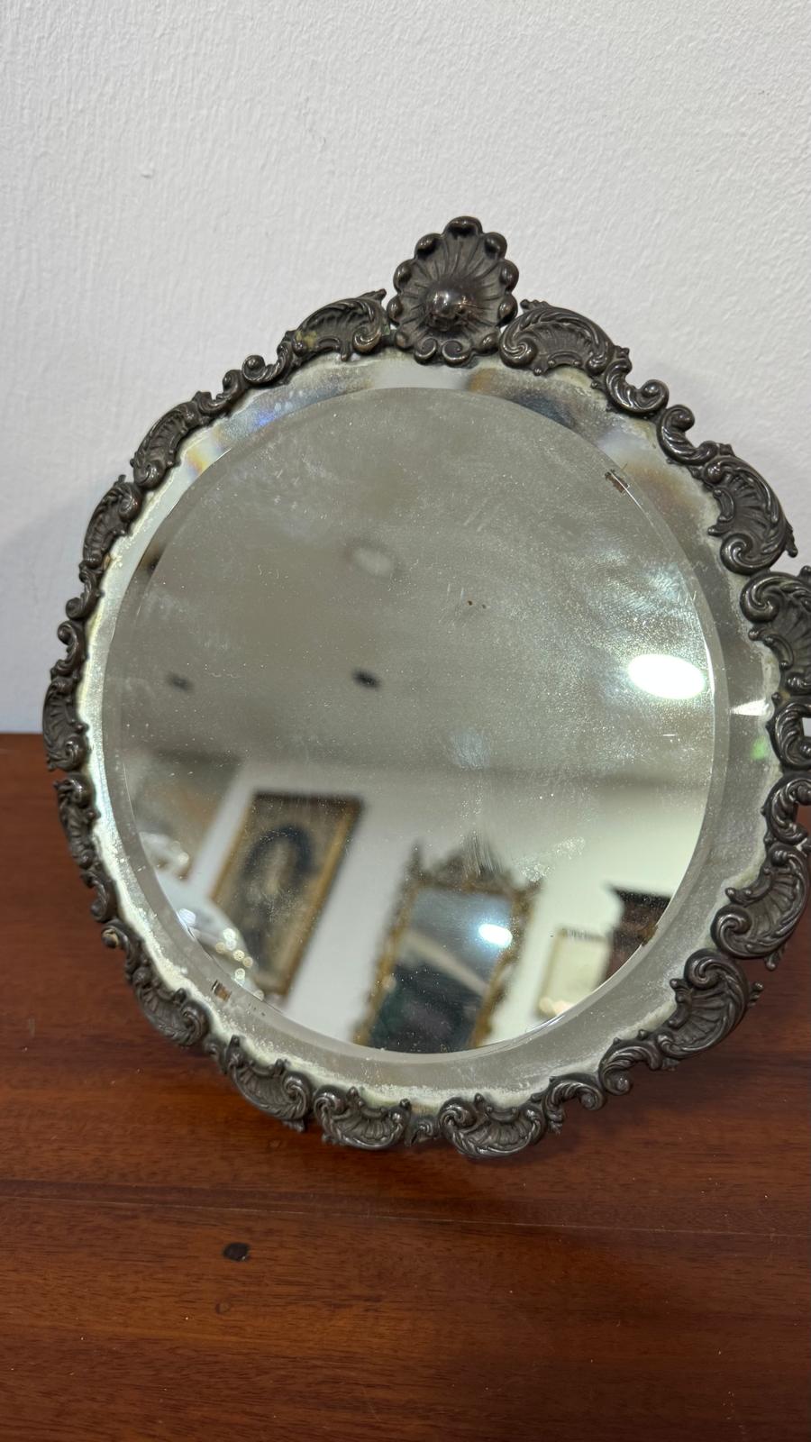 Espelho de coleção: espelho de toucador antigo (espelho plateau), com moldura em prata portuguesa trabalhada em alto-relevo. A peça apresenta marca de contraste oficial, garantindo sua autenticidade e valor histórico.