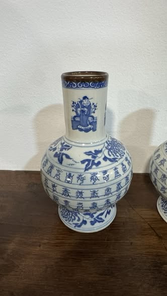 We present this elegant pair of Chinese porcelain vases, produced as a decorative reproduction of the traditional style of the Qianlong period (Qing dynasty, 18th century). Decorated in cobalt blue on a white background, the vases display classical figures, floral patterns, and calligraphic inscriptions in Chinese, evoking the imperial aesthetic of antique porcelain.