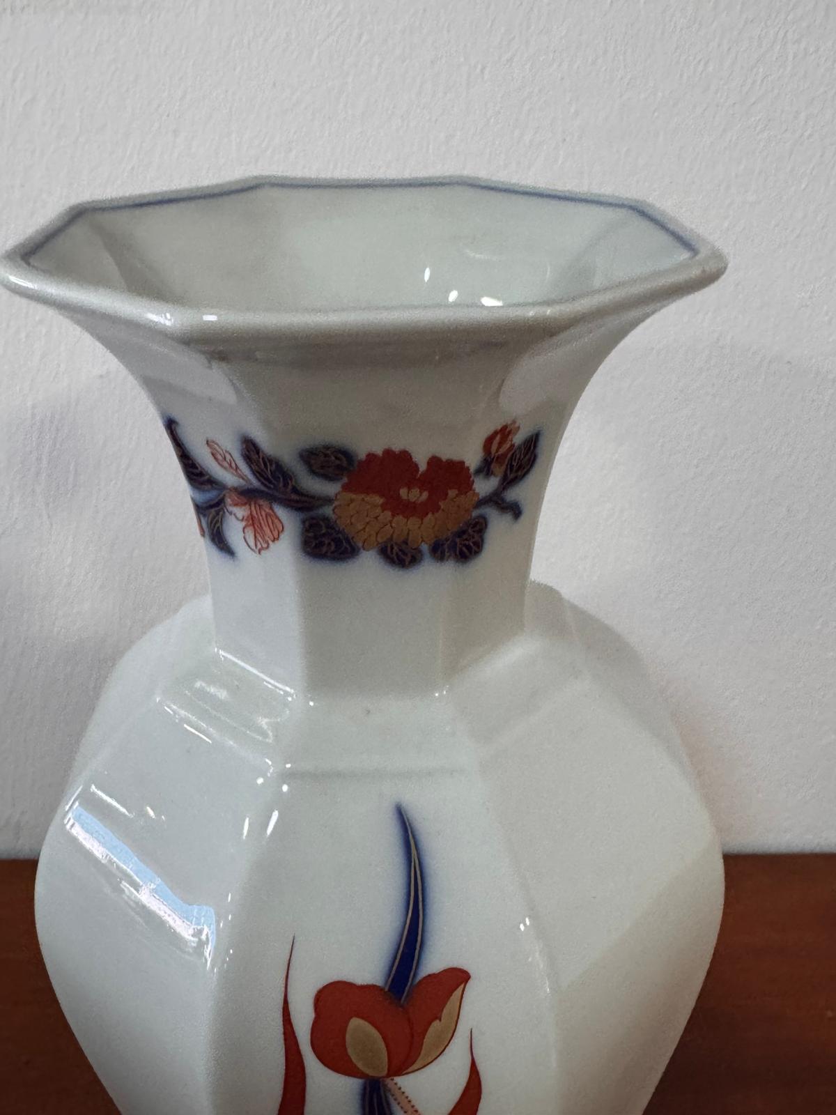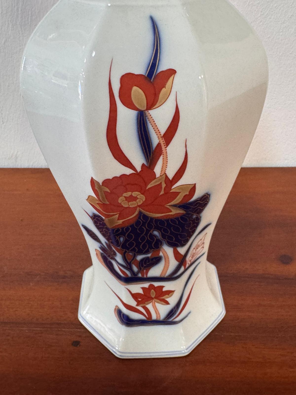 I present this elegant porcelain vase from Vista Alegre, belonging to the prestigious and discontinued "Imari" collection, inspired by traditional 17th-century Japanese oriental decoration. A rare piece of great decorative and historical value.