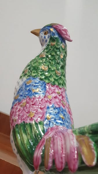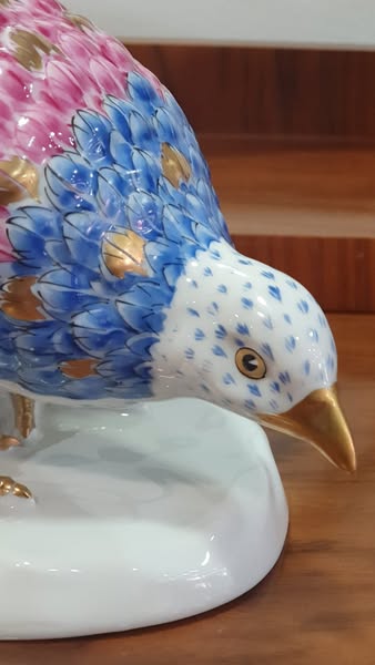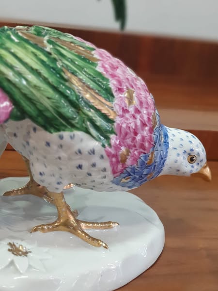 Esculturas em porcelana artística da Vista Alegre, representando faisões macho e fêmea em composição naturalista. Decoração polícroma com pintura manual e realces em dourado.