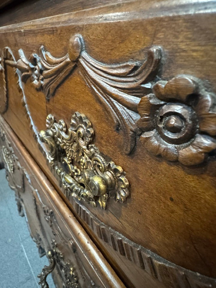 O estilo Luís XV representa o auge do design francês do século XVIII, caracterizado por formas orgânicas, curvas elegantes e ornamentação refinada. Esta cómoda é um testemunho vivo dessa época dourada, perfeita para colecionadores e apreciadores de mobiliário de época.