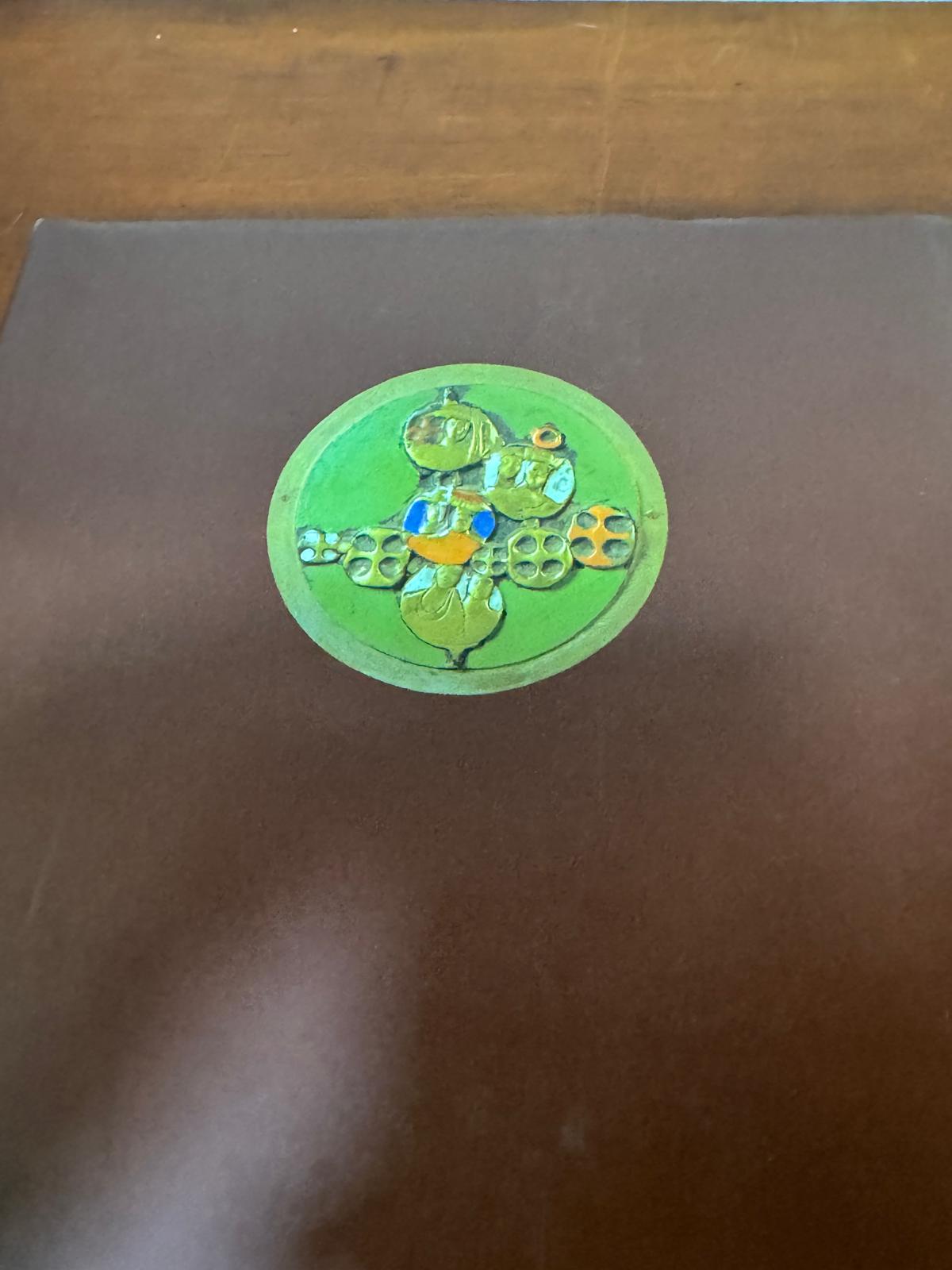 A contracapa apresenta um medalhão circular verde com uma composição decorativa que mostra figuras estilizadas e elementos geométricos em tons de verde, azul, amarelo e laranja, demonstrando a versatilidade cromática e compositiva do artista.