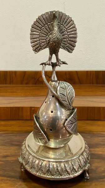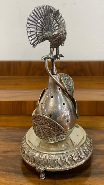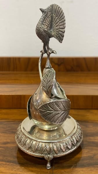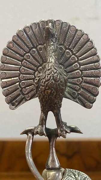 Uma peça de prata com expressão escultórica e simbolismo decorativo — o pavão, em pose altiva, repousa sobre estrutura em forma de pera, envolta por folhas em relevo. A prata contrastada e o trabalho artesanal evocam o prestígio da ourivesaria portuguesa do século XX.