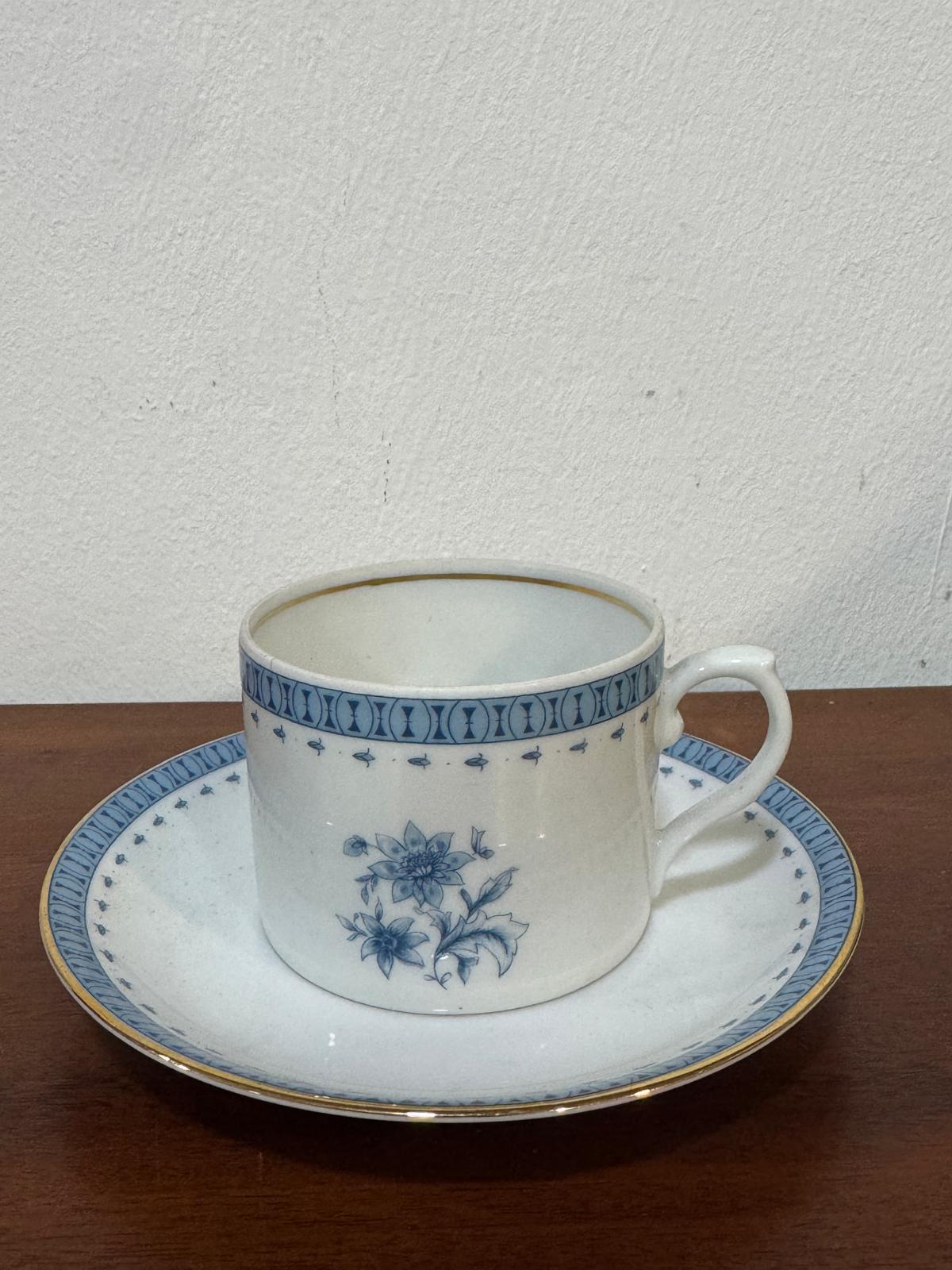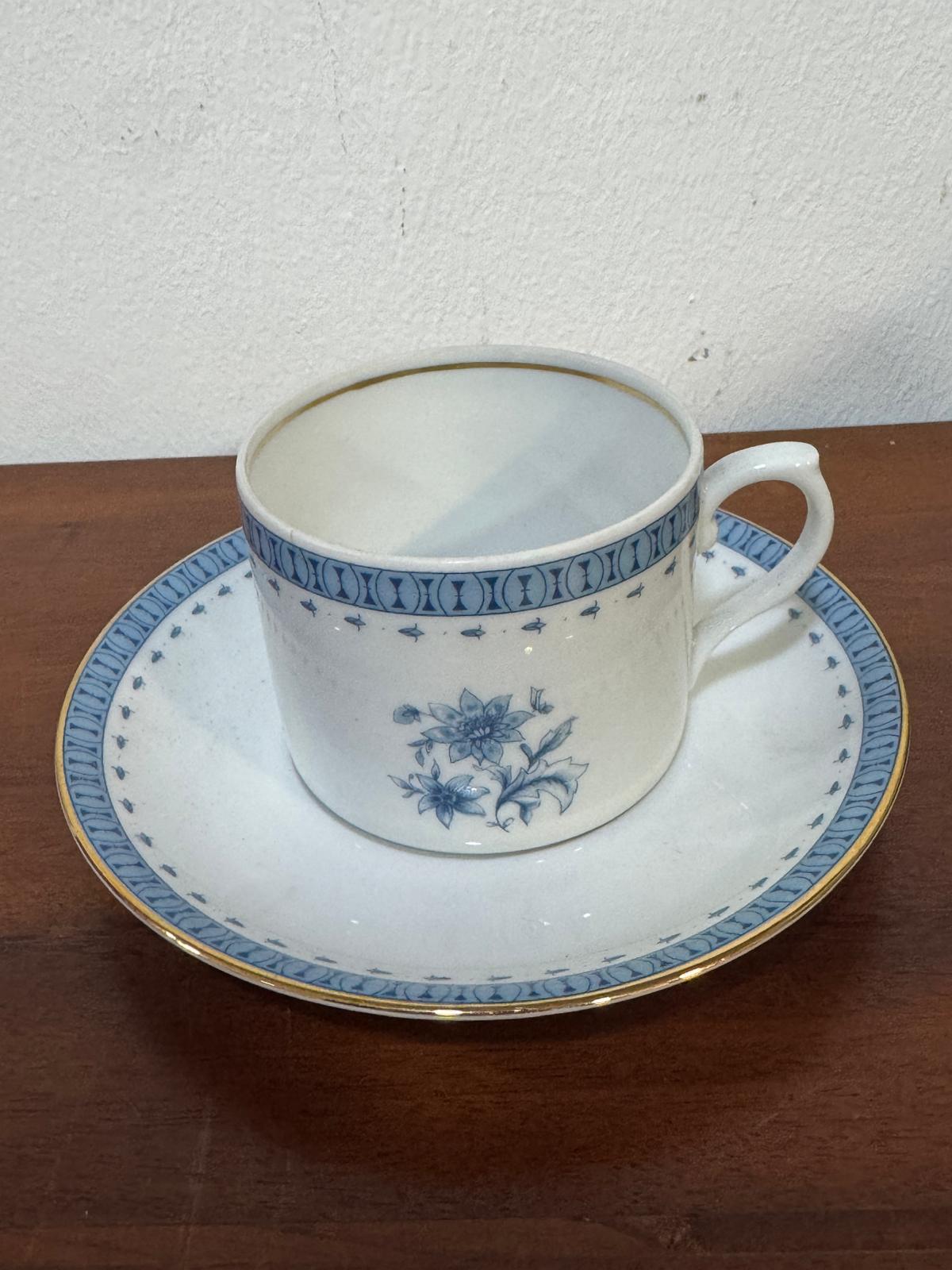 Elegante conjunto de chávena de chá e pires da Vista Alegre, no icónico modelo Cozinha Velha. Esta peça vintage apresenta delicados motivos florais azuis pintados à mão e requintado rebordo dourado no pires.