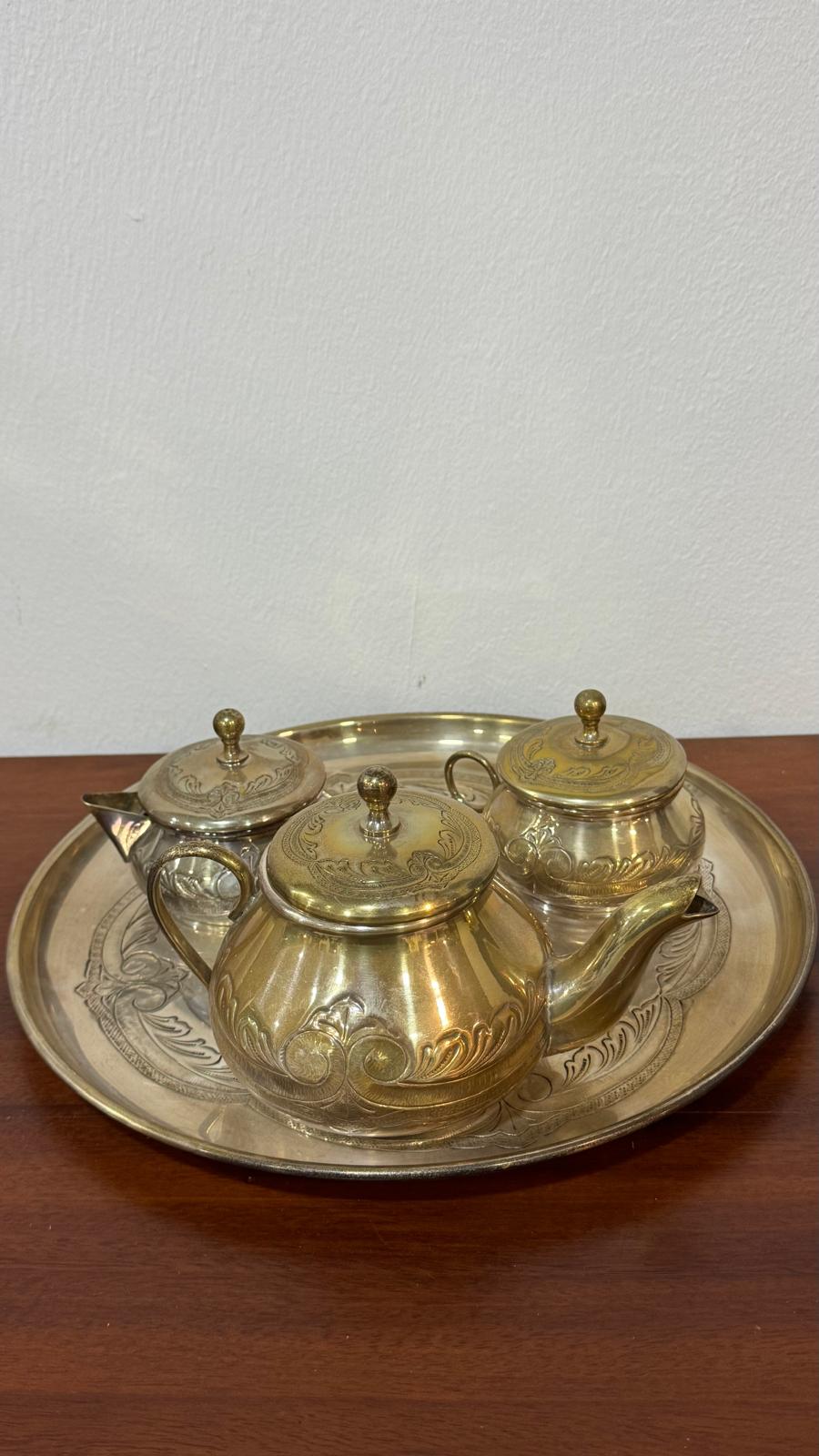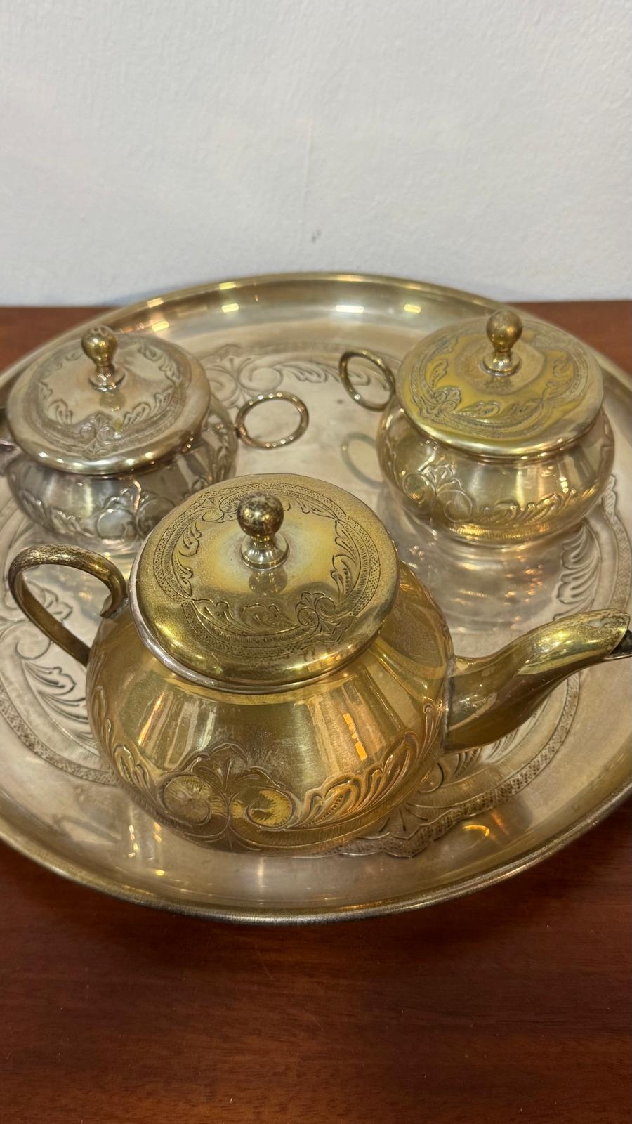 Apresento este conjunto de chá clássico em metal, composto por peças de grande elegância e valor decorativo. Cada item foi cuidadosamente trabalhado com gravações ornamentais que evocam estilos tradicionais marroquinos, persas e otomanos.