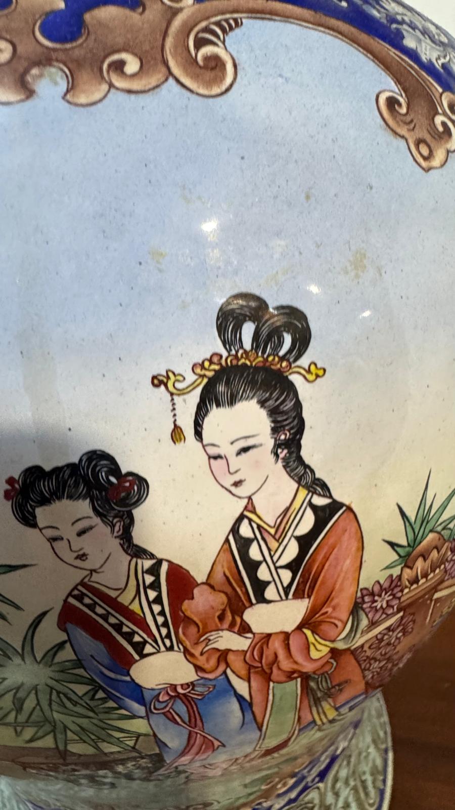 •     Motivos decorativos: Cenas figurativas com personagens em trajes tradicionais, medalhões com caracteres chineses auspiciosos, padrões florais e ornamentais em tons de azul, rosa, dourado e verde
