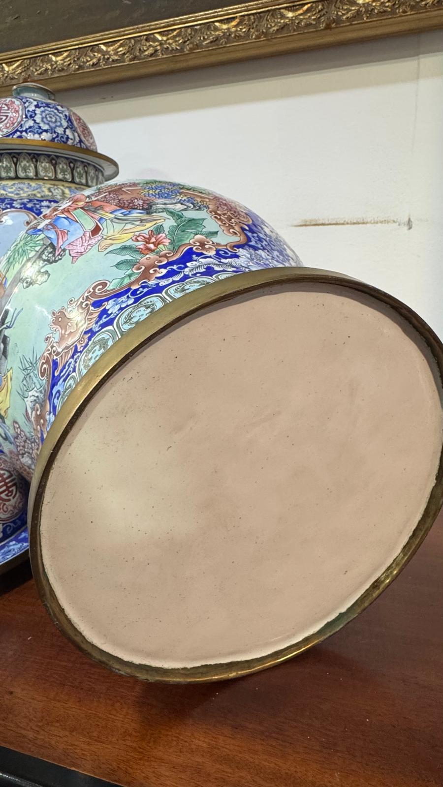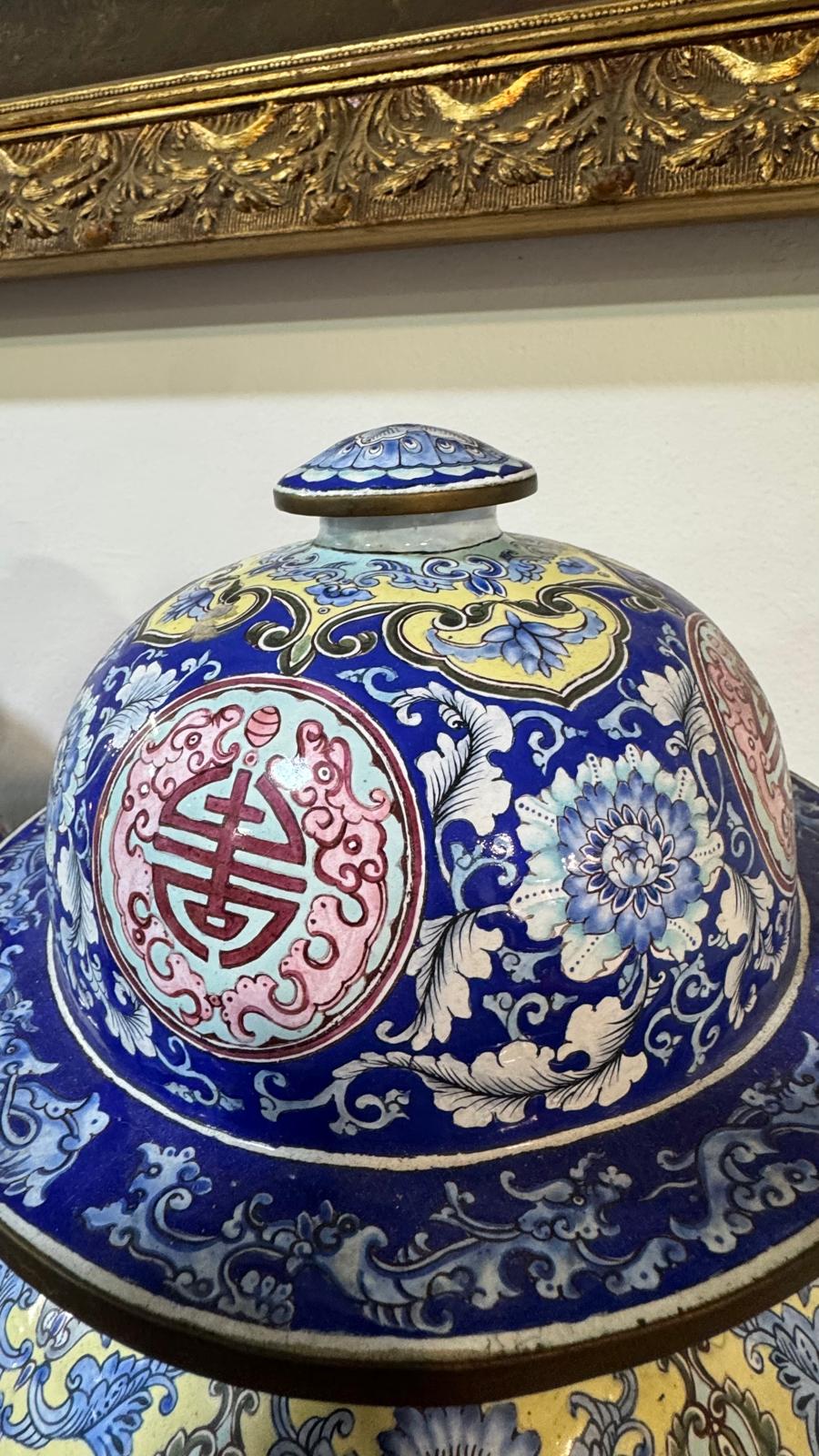 Contexto histórico: Peças deste tipo eram frequentemente produzidas para exportação ou como objetos cerimoniais, refletindo o refinamento técnico e simbólico da arte chinesa do período Qing. A presença de medalhões e cenas narrativas sugere uma função decorativa e simbólica, associada à prosperidade, longevidade e harmonia.
